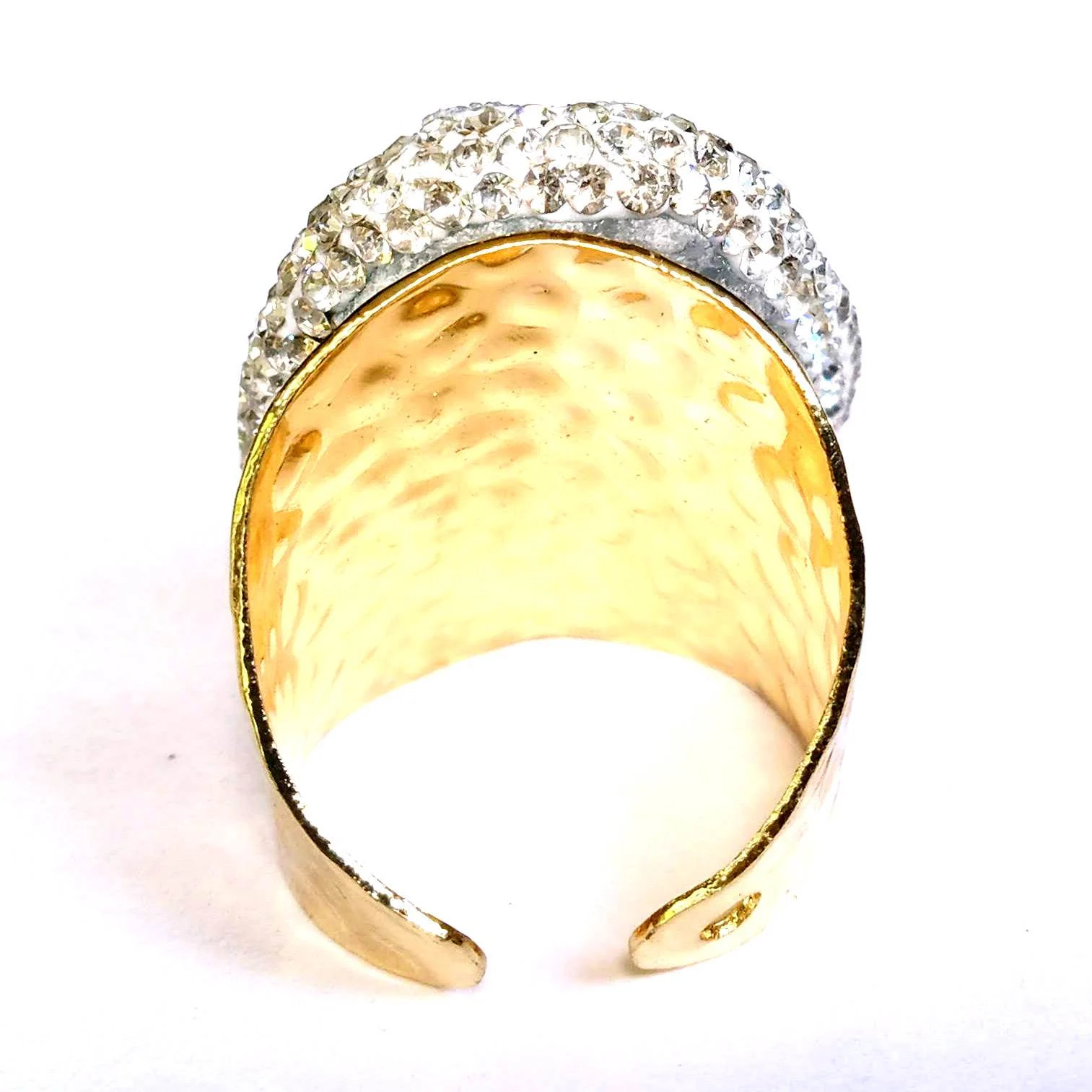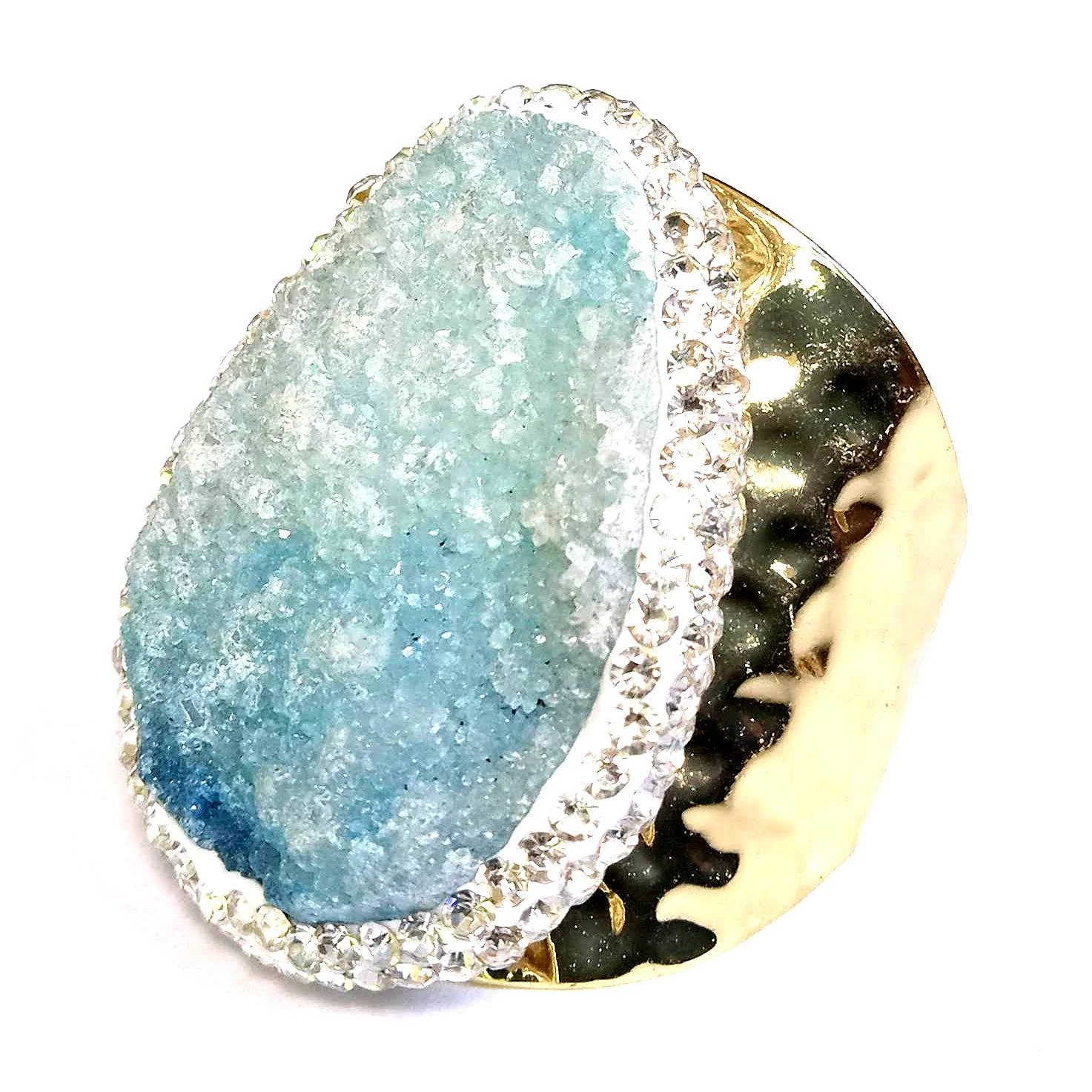 Men’s cocktail dinner ring with a very large sky blue colored drusy agate genuine center stone surrounded by 2 rows of 3mm shimmering clear rhinestones which highlight the aqua colored center stone. This dramatic ring sits upon a wide, hammered brass band that is sturdy and adjustable. No need for resizing. Total carat weight of this ring including rhinestones and setting is 63.5 carats/12.7 grams. A fun and essential piece to any gentleman’s jewelry collection.