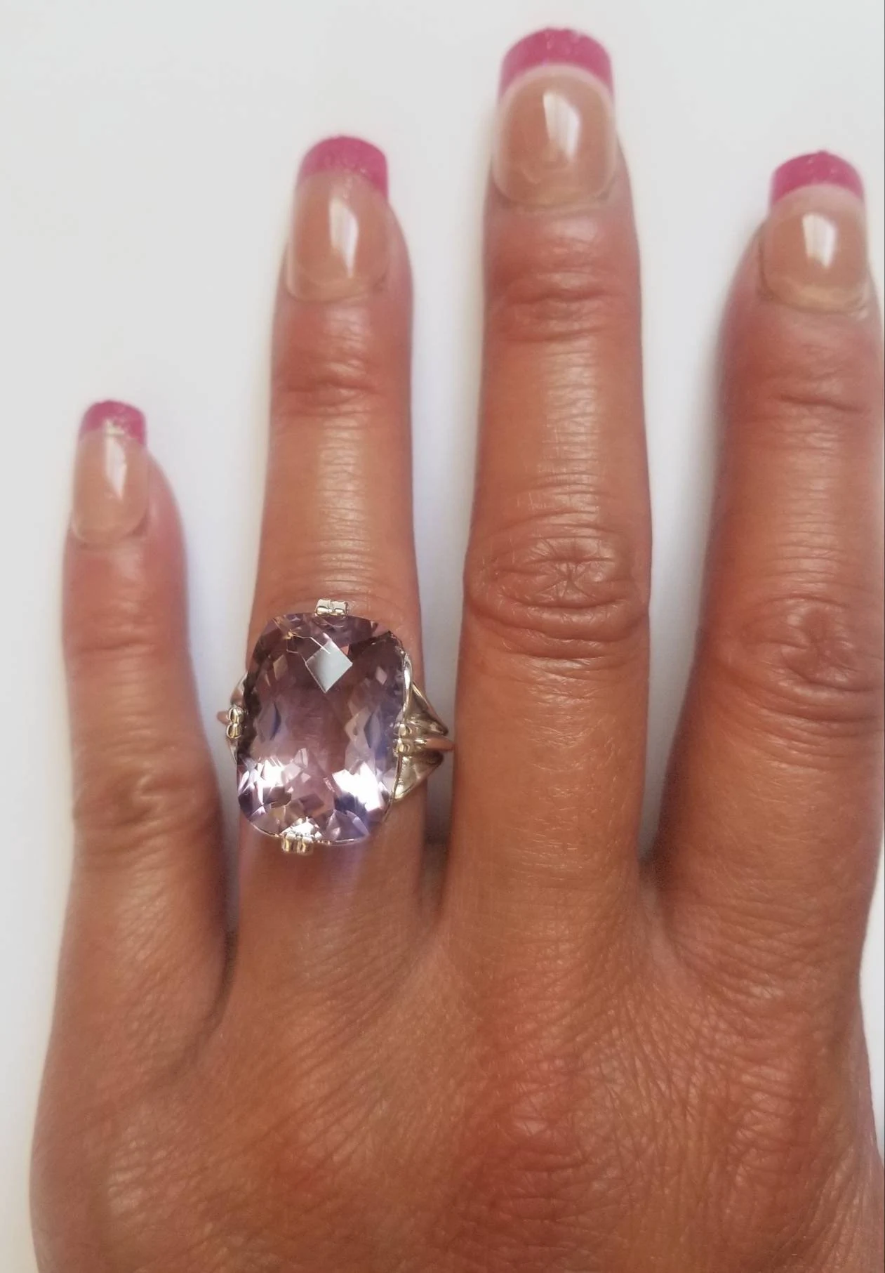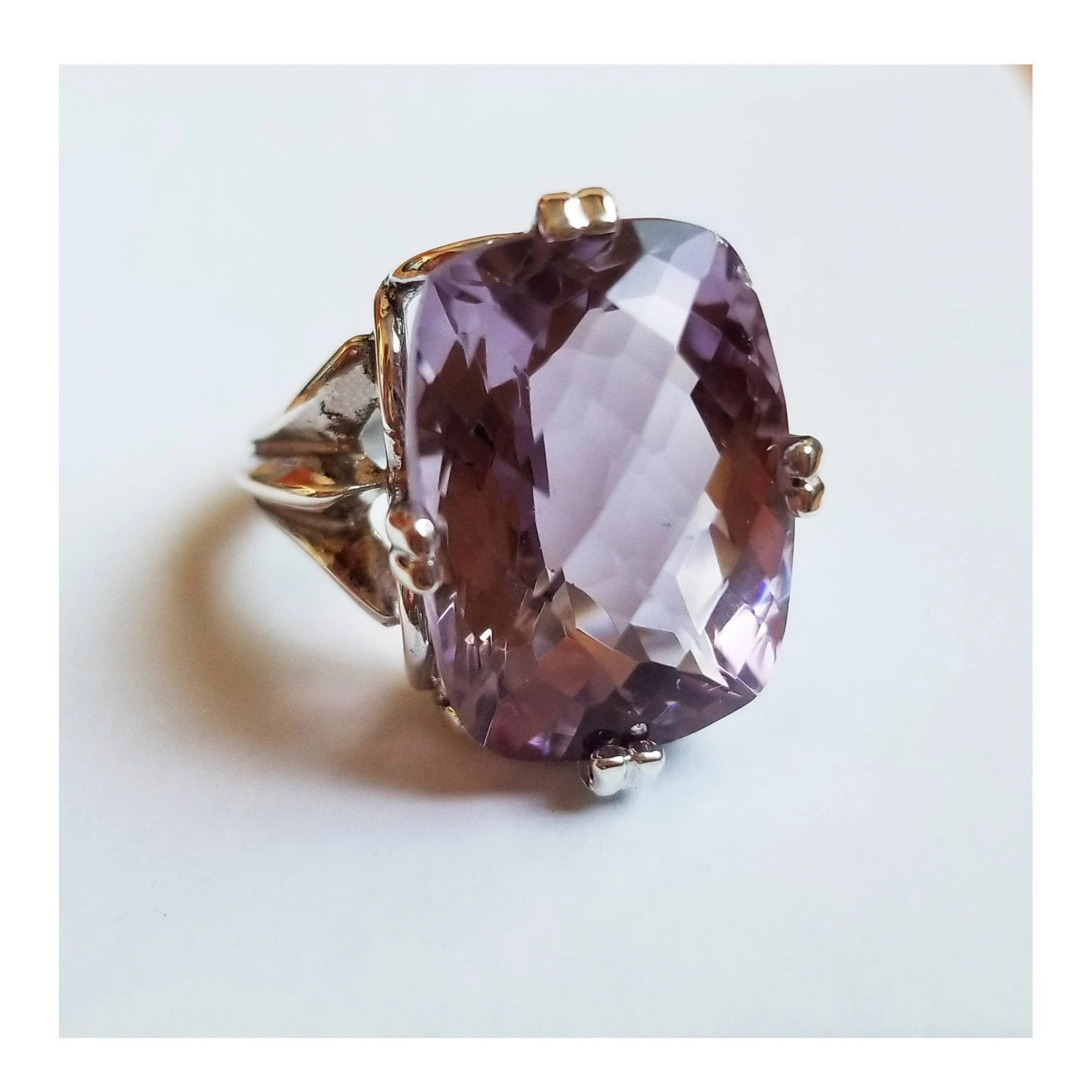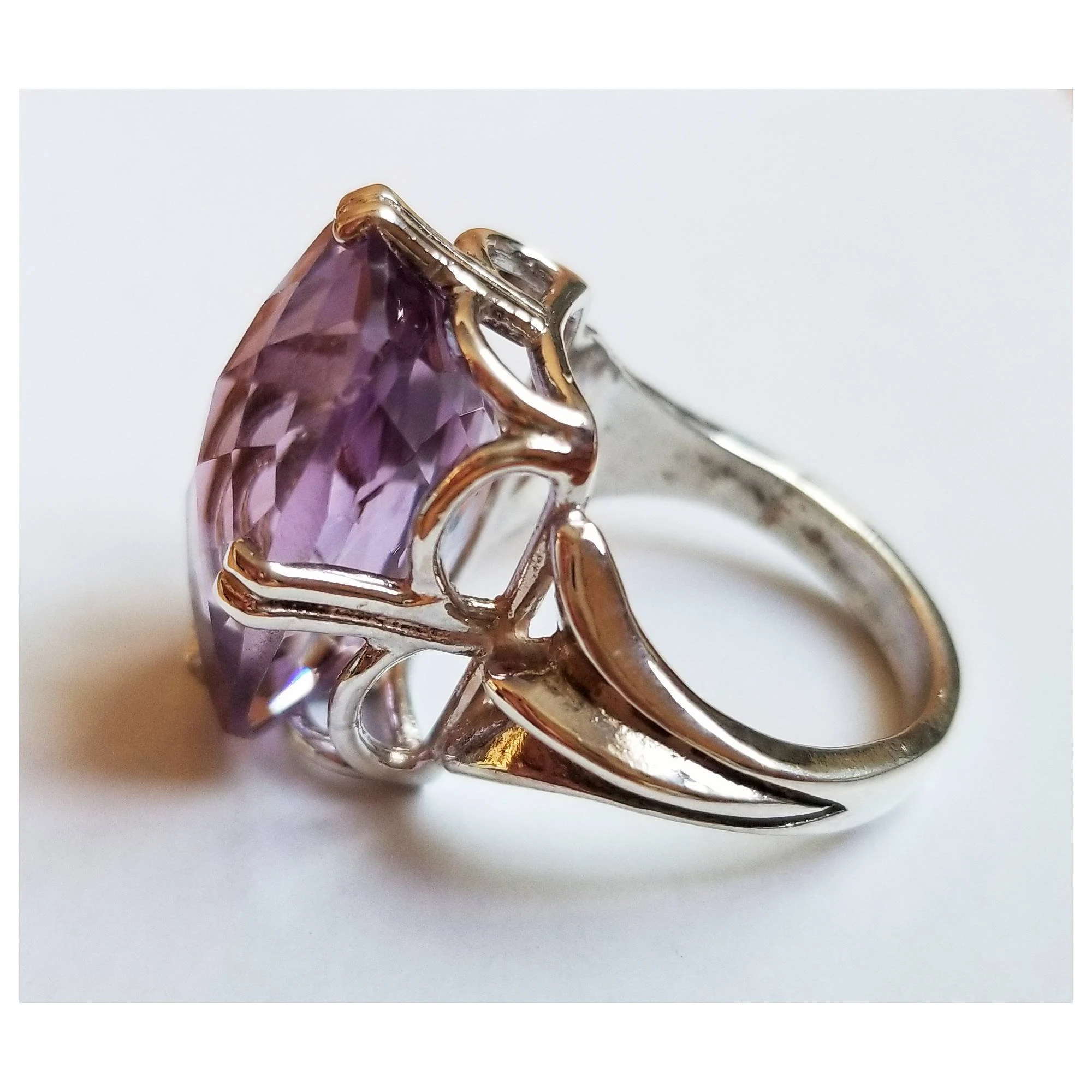This cocktail ring has amazing sparkle and shine. The many facets on the surface of this genuine 18×13 millimeter amethyst gemstone give it brilliance. 18 mm is equal to .7 inches. The color is medium to light purple and the setting is a simple silver prong setting. Affordable yet large and eye catching. May be resized by your local jeweler.