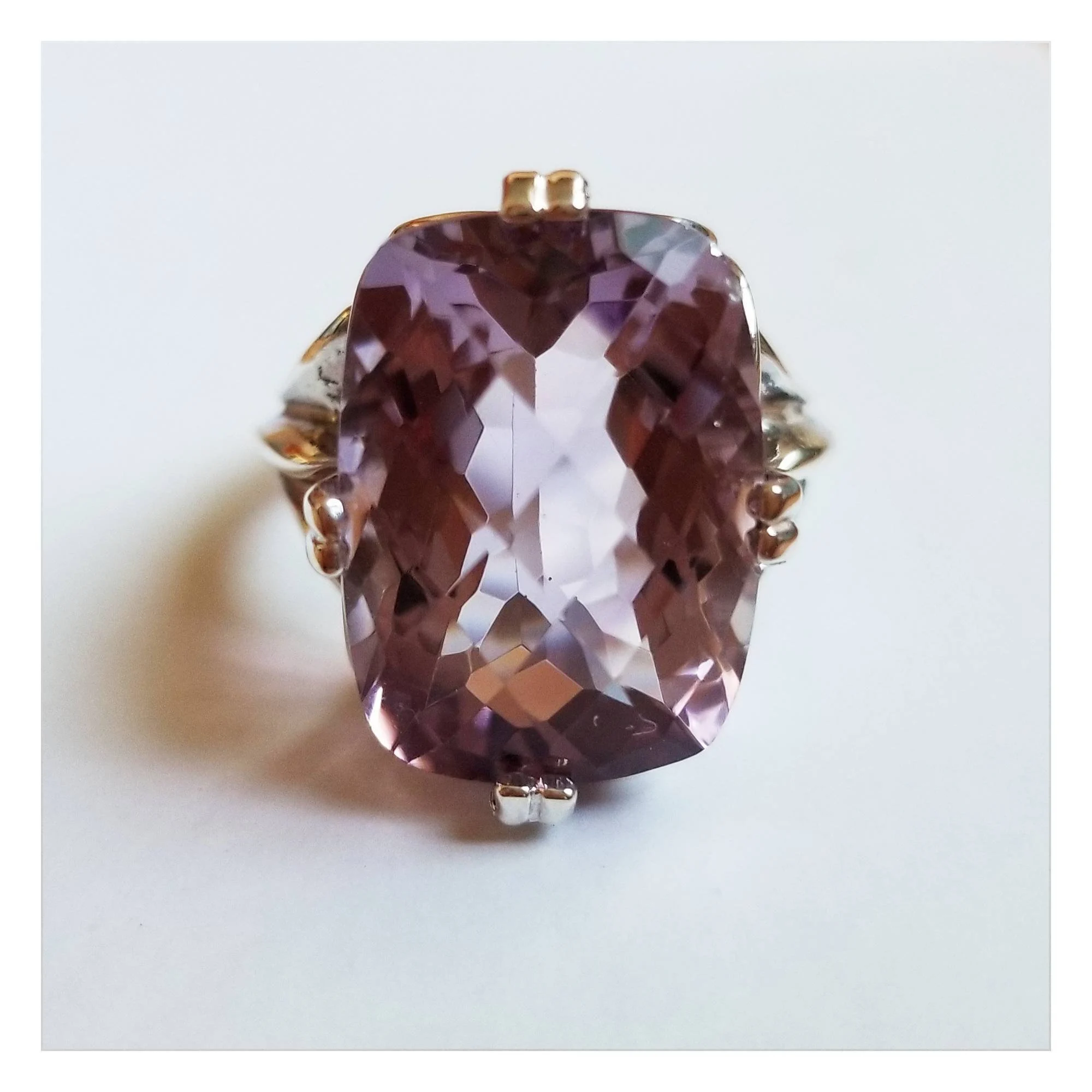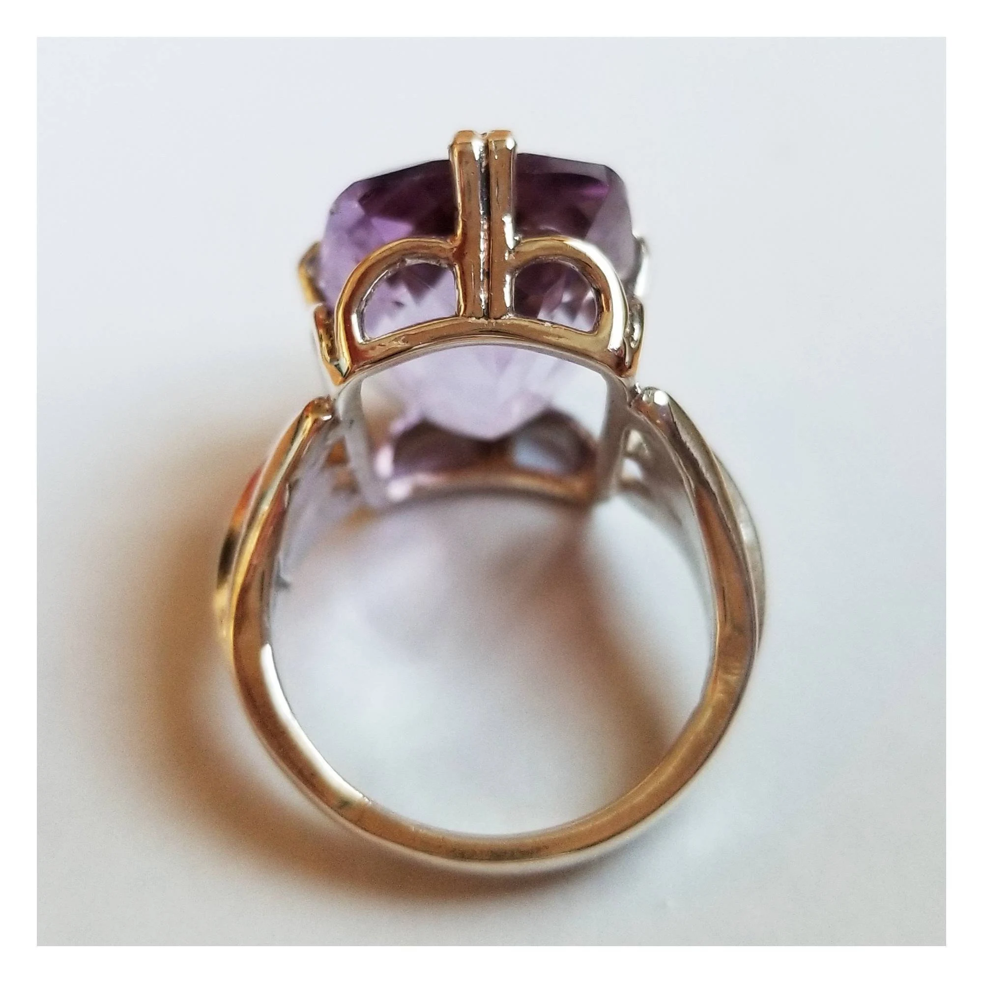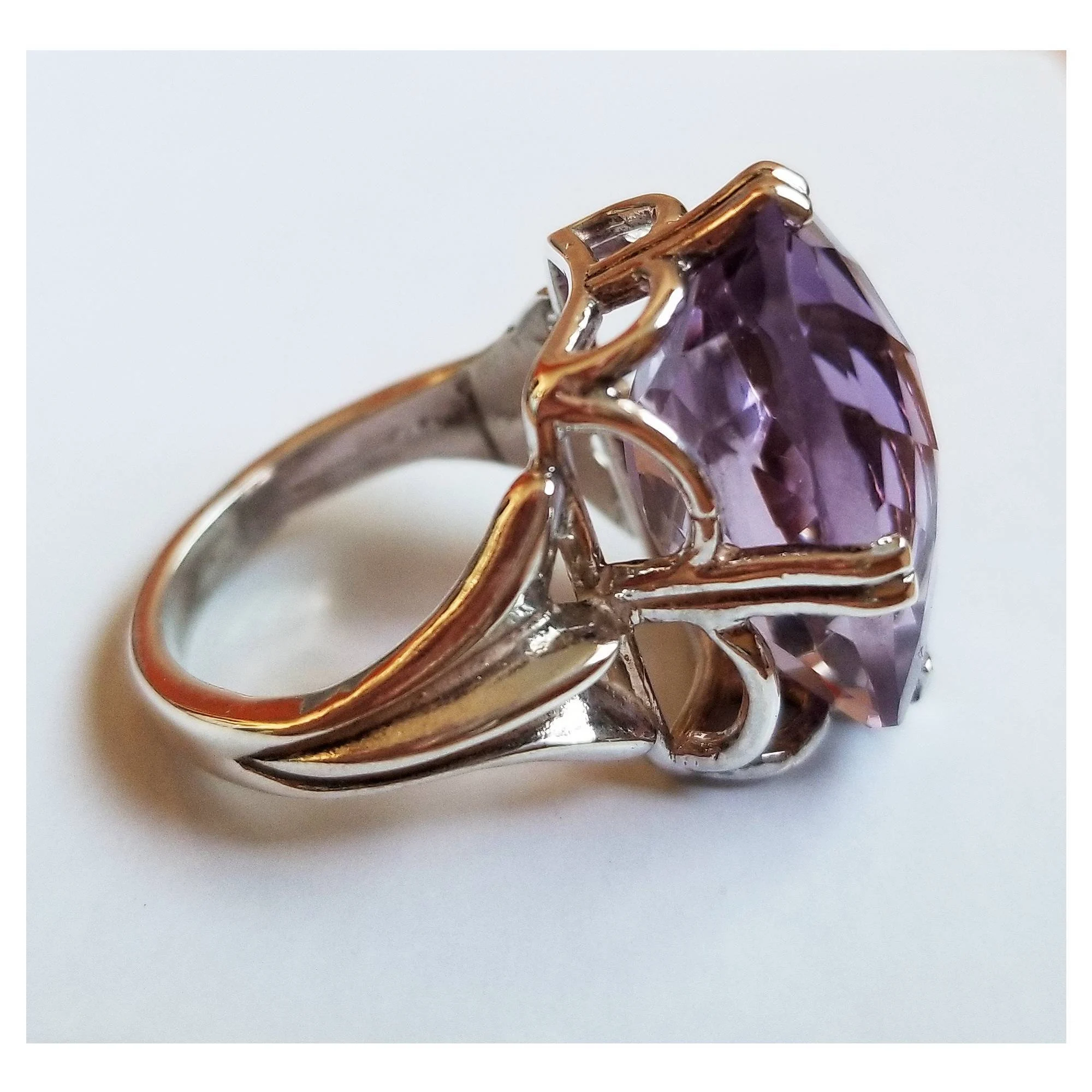 This cocktail ring has amazing sparkle and shine. The many facets on the surface of this genuine 18×13 millimeter amethyst gemstone give it brilliance. 18 mm is equal to .7 inches. The color is medium to light purple and the setting is a simple silver prong setting. Affordable yet large and eye catching. May be resized by your local jeweler.